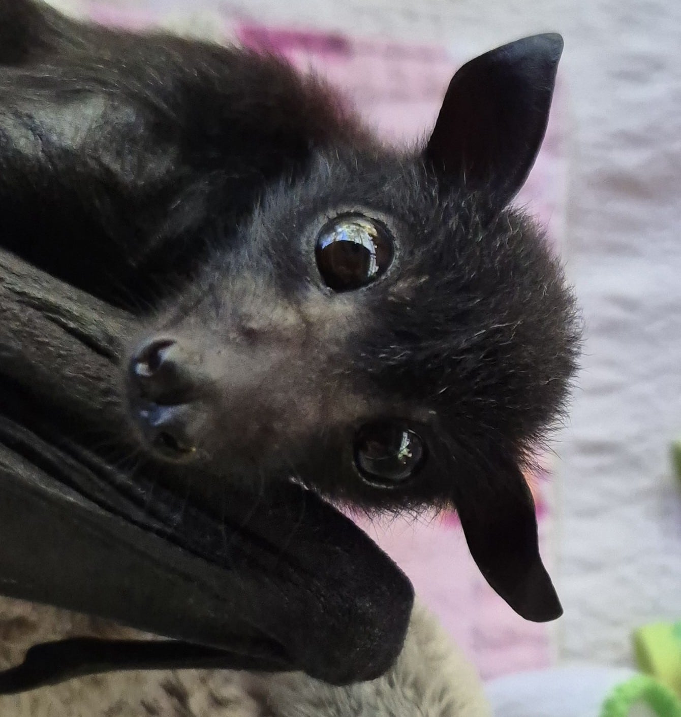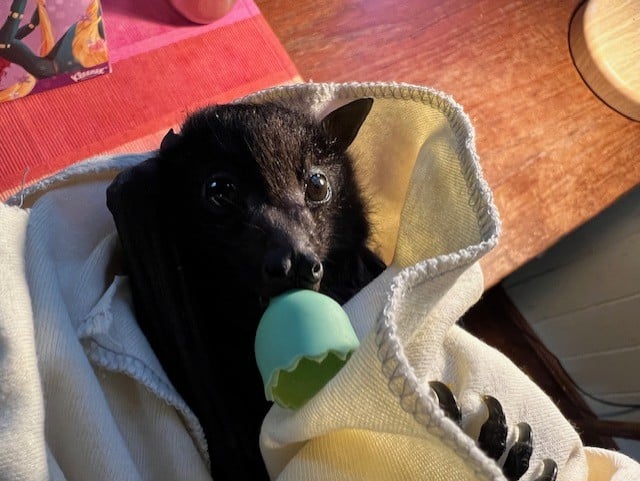 Meet Brian, a smart, cheeky, and adventurous male black flying fox with a heart-warming story. Found abandoned, cold, and hungry in Stanthorpe at just 10 days old, Brian faced a rough start to life. With a misshapen ear and early health struggles including dermatitis and an ear infection, his future was uncertain. But thanks to expert care and a lot of love, Brian made a strong recovery and is now at a healthy weight.